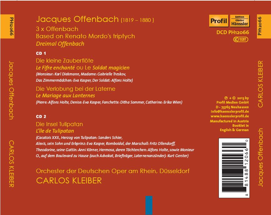Fassung der Neuinszenierung für die Deutsche Oper am Rhein von Günther Roth unter dem Titel „3 x Offenbach“ in Deutsch unter musikalischer Leitung von Carlos Kleiber auf der Basis der von Renato Mordo bearbeiteten und zu einem Triptychon „Dreimal Offenbach“ ver-bundenen drei Operetten-Einakter, Aufnahme vom 1. Dezember 1962 Deutsche Oper am Rhein aus Düsseldorf mit dem dortigen Opernorchester aus der Vorstellungsserie mit Premie-re am 27. Juni 1962.